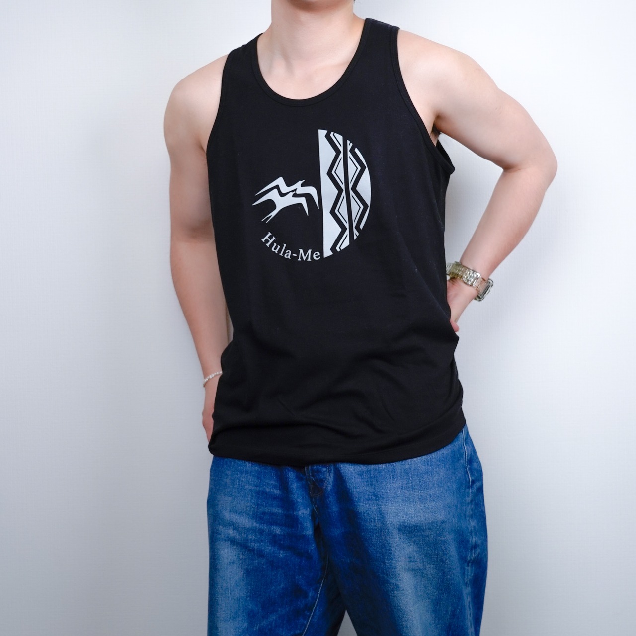 可愛いタンクトップを追加しました。こちらのブラックのタンクトップはHula-Meのオリジナル商品となります。サイズは若干大きめにできているとスタッフ一同は感じました。モデルの女性(ブルー)はMサイズを、男性(ブラック)はXLを着用しております。ぜひご参考にして下さい。