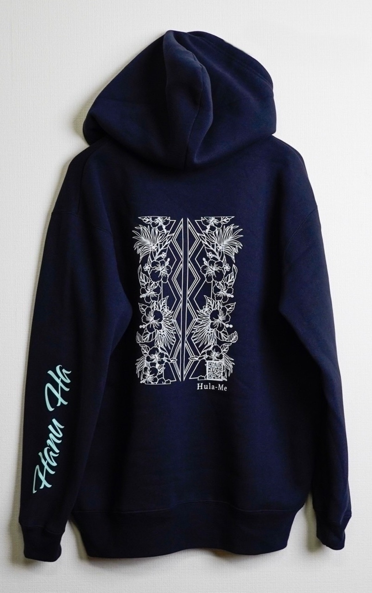 色はネイビーでチャックの部分はシルバーとなります。左腕のミントグリーンのハヌハーとの色の調和が自慢のパーカーです。